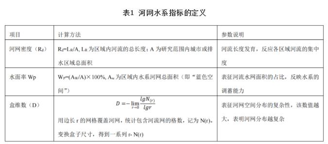 河網(wǎng)調(diào)蓄能力是水系在水文方面的重要功能之一,尤其在削減洪峰、降低洪水危害中具有重要的作用。受人類活動影響,尤其是近半個世紀(jì)年以來快速城鎮(zhèn)化引起的土地利用方式變化,致使許多城區(qū)河流、水塘、水淀區(qū)被掩埋甚至完全消失,導(dǎo)致城市水面率大幅減少,河網(wǎng)、水系發(fā)育及演變也表現(xiàn)出由復(fù)雜到簡單、由多元到單一的變化趨勢。世界范圍內(nèi)60%以上的河流受到城市化的影響,而城市化對河流生態(tài)完整性及生態(tài)功能造成了嚴(yán)重威脅;從國內(nèi)外經(jīng)驗看,這種演變無疑還會加劇洪澇災(zāi)害、水質(zhì)惡化等問題。借助河道容蓄指標(biāo)與水系結(jié)構(gòu)參數(shù)的相關(guān)關(guān)系分析河網(wǎng)結(jié)構(gòu)對調(diào)蓄能力的影響,常用的水系變化指標(biāo)包括數(shù)量特征參數(shù)和復(fù)雜性參數(shù),選取河網(wǎng)密度(Rd)、水面率(WP)描述水系的數(shù)量特征,河網(wǎng)盒維數(shù)描述水系的復(fù)雜性特征,各指標(biāo)計算方法及內(nèi)涵見表1。
