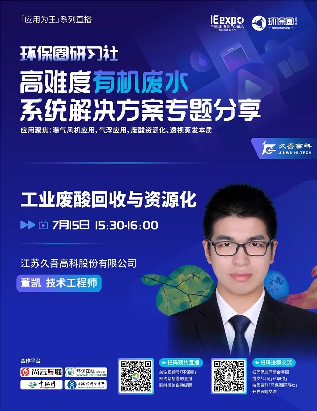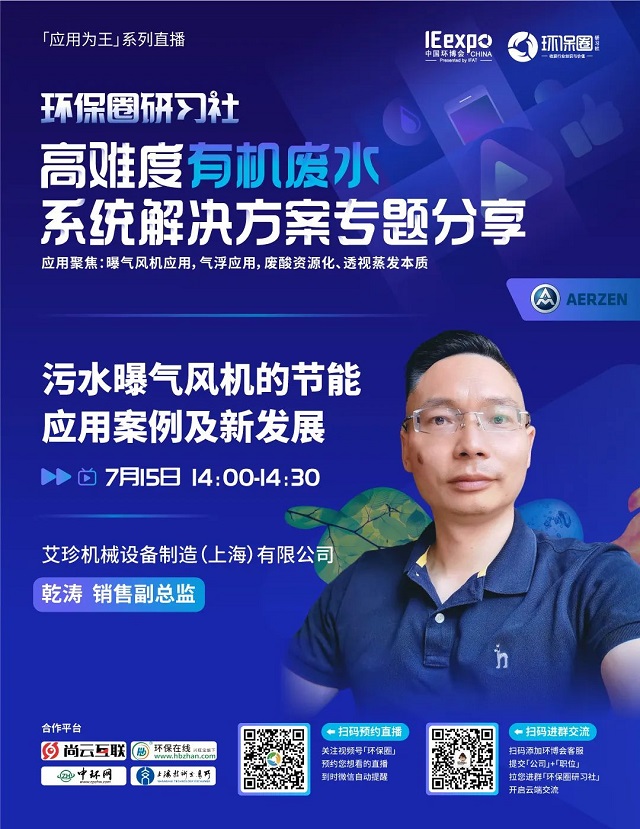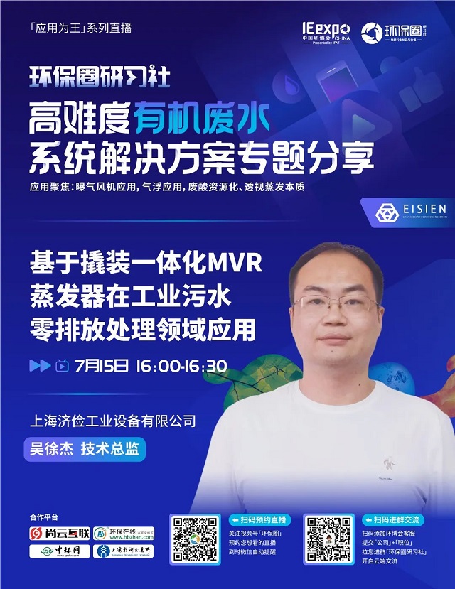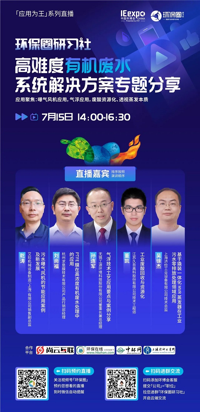 7月15日(星期五)下午14:00-16:30,環(huán)保圈研習(xí)社“應(yīng)用為王”系列直播高難度有機(jī)廢水系統(tǒng)解決方案專題分享,有幸邀請到了艾珍機(jī)械、求是膜、工源環(huán)境、久吾高科、上海濟(jì)儉5家企業(yè)的技術(shù)專家做客直播間,與我們共同探討“水環(huán)境”污染處理問題,并為大家?guī)砀唠y度有機(jī)廢水的節(jié)能處理、資源化利用、零排放處理等相關(guān)技術(shù)及解決方案分享。