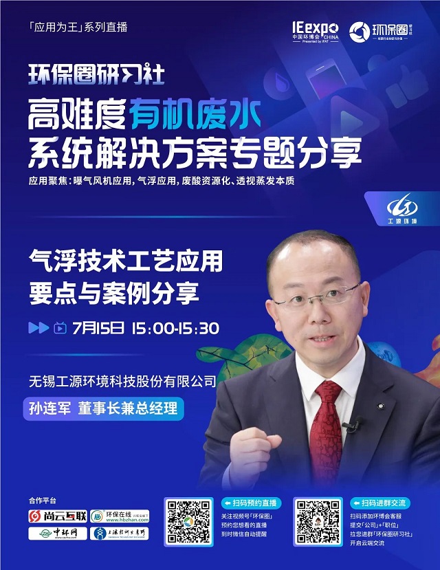本場直播由工源環(huán)境董事長兼總經(jīng)理孫連軍先生——擁有近30年環(huán)保行業(yè)從業(yè)經(jīng)驗的環(huán)保人,親自為您講解氣浮技術(shù)工藝應(yīng)用要點,并帶來大量現(xiàn)場應(yīng)用實例展示,如果您的項目有提標(biāo)除磷、河湖水體除藻治理、高濃廢水(廚余垃圾、屠宰、養(yǎng)殖、垃圾滲濾液、化工廢水等)這些困擾,更不能錯過本場直播!