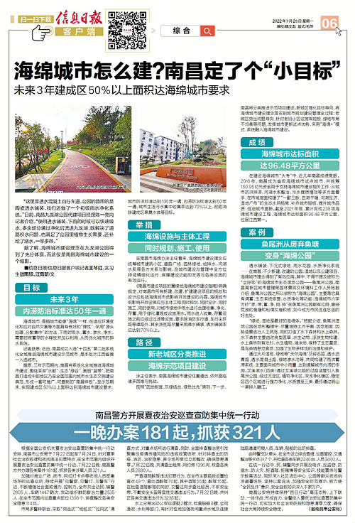 在建設(shè)海綿城市“大考”中,近幾年南昌成績亮眼。2016年,南昌成為省級海綿城市試點(diǎn)城市,共統(tǒng)籌150.95億元資金用于支持海綿城市建設(shè)相關(guān)工作,從城市防洪排澇、河湖水系整治、污水提質(zhì)增效等多方面著手,在市域?qū)用鏄?gòu)建了“一鄱三脈,百湖千塘,河湖互濟(jì),濕地廣布”的生態(tài)水網(wǎng)格局,補(bǔ)齊城市短板、提升城市品質(zhì)、促進(jìn)城市更新。截至2021年底,累計完成238項(xiàng)海綿城市建設(shè)工程,海綿城市達(dá)標(biāo)面積96.48平方公里,位居江西第一。