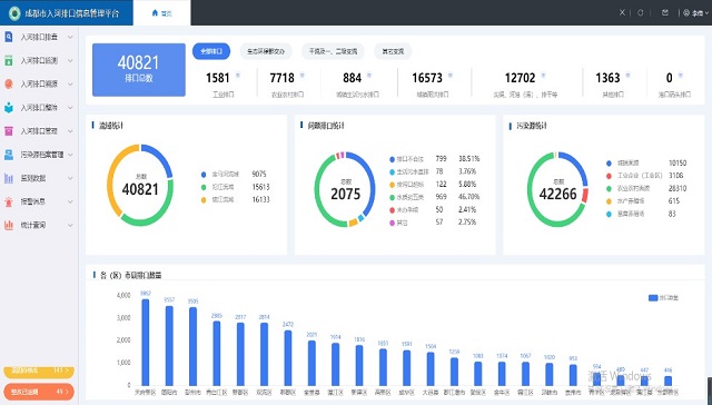 PC端的“成都市入河排口信息管理平臺”則主要用于后臺信息管理,包括數據審核、統計分析、問題調度等,面向各級行政管理人員和數據審核人員。除記錄排口信息、周邊環(huán)境、水質水量等數據外,還能利用大數據平臺實現排污口信息的整體呈現和入河排污口“一張圖”管理,便于分區(qū)域、分類別整治排污口,因口施策。