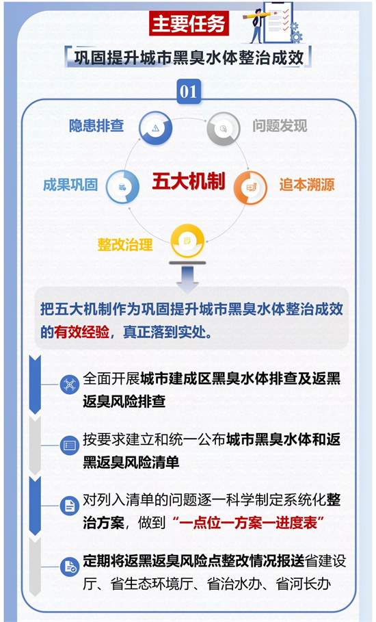 《方案》要求各地認真貫徹黨的二十大精神,深入踐行習近平生態文明思想,認真落實省第十五次黨代會精神和省委、省政府決策部署,堅持綜合治理、系統治理、源頭治理,堅持科學、精準、依法治污,以提升城市污水垃圾收集處理效能為重點,補齊城市環境基礎設施短板,加強各類污染源治理,鞏固提升城市黑臭水體整治成效,建立健全長效管理機制,確保已經完成治理、實現不黑不臭的水體長治久清,返黑返臭風險全面消除。以城市黑臭水體整治成效鞏固提升,推動農村黑臭水體治理,不斷增強人民群眾良好水生態環境獲得感、幸福感、安全感。