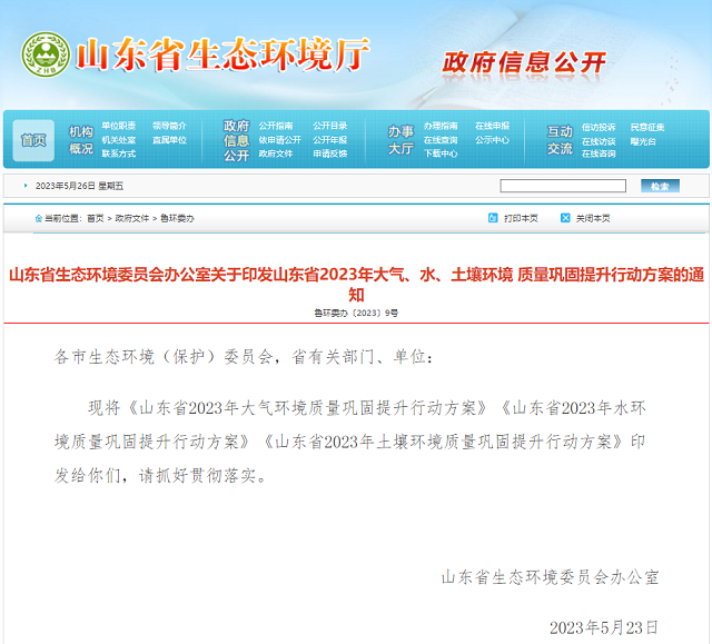 5月23日,山東省生態環境廳發布《山東省2023年水環境質量鞏固提升行動方案》,主要目標為國控重點斷面水質優良(達到或優于Ⅲ類)比例不低于68.6%,V類及以下水體保持動態清零,其中南四湖流域國控斷面水質優良比例達到100%,南水北調干線優良水體比例達到100%,黃河流域水環境質量保持穩定。16個設區市地表水環境質量排名力爭退出全國“后30”。縣級及以上城市集中式飲用水水源水質達到或優于Ⅲ類比例不低于97.4%。山東省近岸海域優良水質比例達到91%。