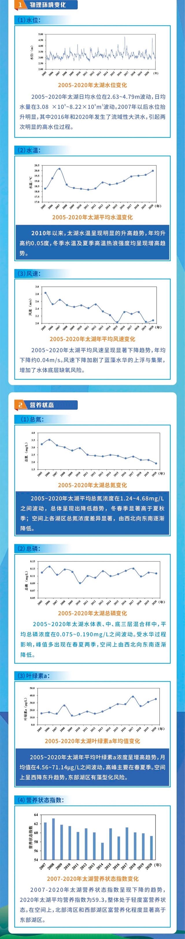 作為我國第三大淡水湖,太湖是長三角地區(qū)重要的水資源調(diào)配中心,是上海、蘇州、無錫、湖州等城市的主要飲用水水源地,年供水量約12億m3。2005-2020年間,太湖地理環(huán)境、營養(yǎng)狀態(tài)、生態(tài)系統(tǒng)結(jié)構(gòu)和演化趨勢等方面發(fā)生了什么樣的變化?近日,中國科學院南京地理與湖泊研究所發(fā)布《中國湖泊生態(tài)環(huán)境研究報告》系列,以數(shù)據(jù)可視化、敘述科普化的方式,呈現(xiàn)中國重要湖泊的現(xiàn)狀,診斷生態(tài)環(huán)境狀況和發(fā)展趨勢,提出湖泊及其流域在生態(tài)環(huán)境保護、治理和修復方面的對策與建議。