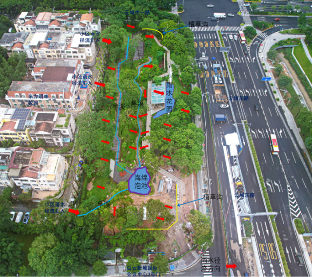為解決以上問題,本項目因地制宜設置植草溝、透水鋪裝、旱溪、蓄水池等海綿設施,起到源頭減排、過程控制、末端治理回用效果,并充分發(fā)揮公園綠地對雨水徑流消減及過濾凈化的作用,減少周邊市政管網及下游河道排水壓力。