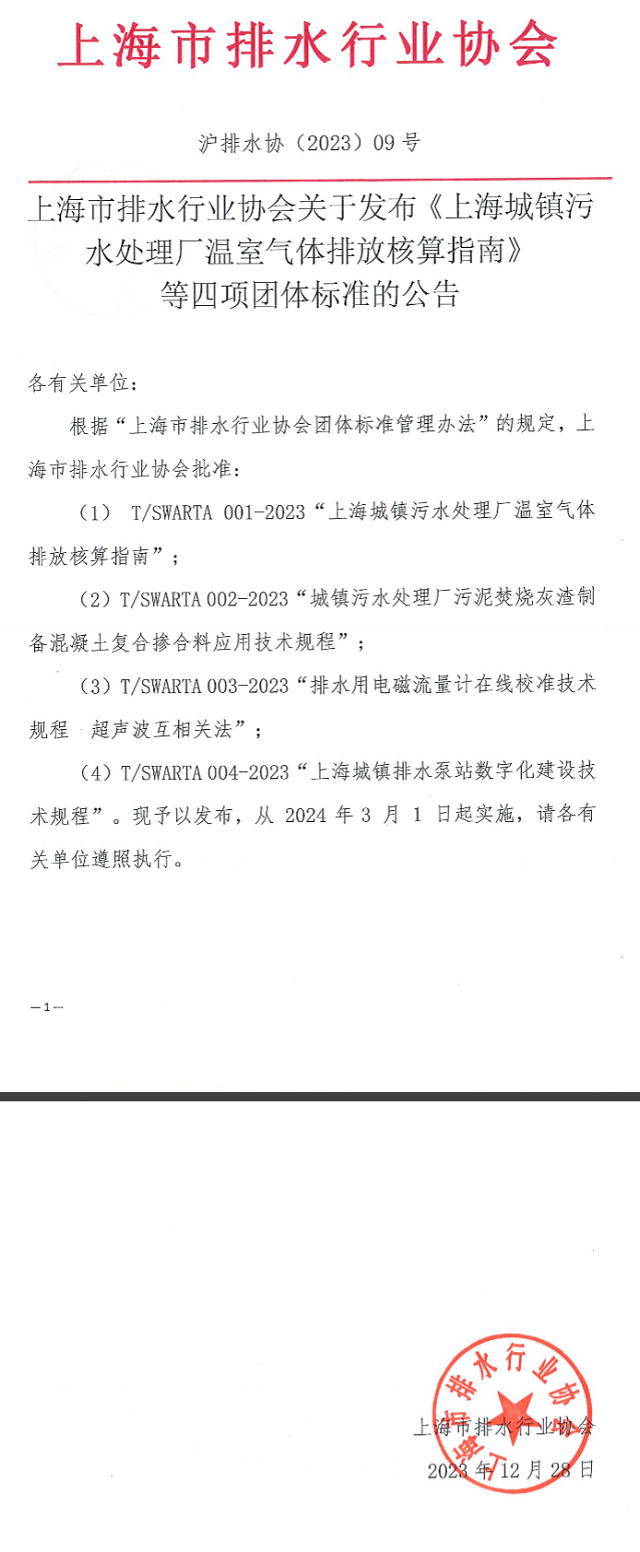 2023年12月28日,T/SWARTA004—2023《上海城鎮排水泵站數字化建設技術規程》團體標準經由上海市排水行業協會發布。文件起草單位為上海市城市排水有限公司,文件將于2024年3月1日起正式施行。