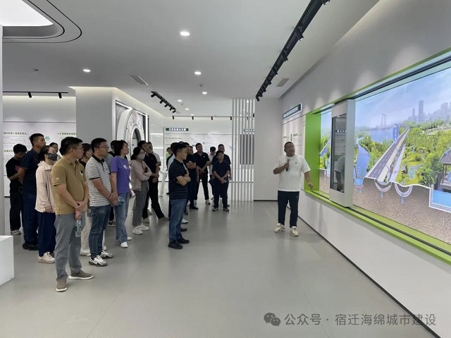 在宿遷市海綿城市展示館,雨水徑流模型、數字沙盤、視頻科普等讓參會人員對宿遷市海綿城市建設有了更深的認識,場地內雨水花園、下沉式綠地、雨水花箱、生態停車位等海綿設施,每一處細節都彰顯著生態與美學的和諧共生,參會人員紛紛表示現場觀摩學習對海綿城市高質量建設提供了樣板。