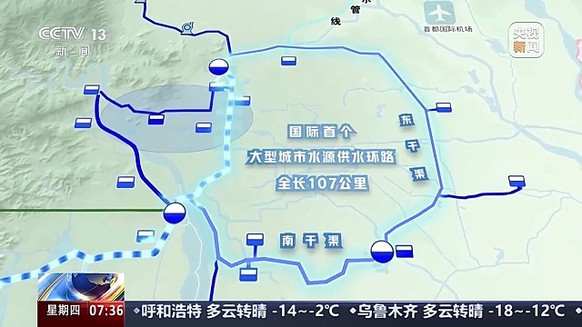 南水進入北京后,主要是通過暗涵和管道來進行輸水,從2014年年底南水北調中線工程通水開始,北京就建起了一條地下“輸水巨龍”,這條巨龍沿著北京的北五環、東五環、南五環,與沿著西四環的南水北調中線主干線相連,形成了一條全長107公里的供水環路。