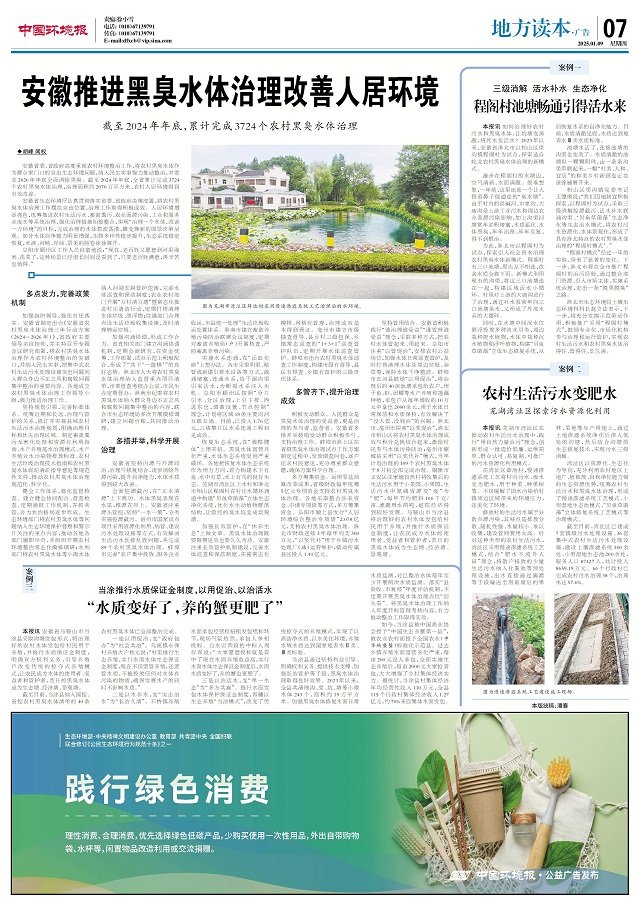 安徽省委、省政府高度重視農村環境整治工作,將農村黑臭水體作為群眾家門口的突出生態環境問題,納入民生實事強力推動整治,并要求2026年年底全面消除黑臭。截至2024年年底,全省累計完成3724個農村黑臭水體治理,治理面積約2070萬平方米,農村人居環境得到有效改善。