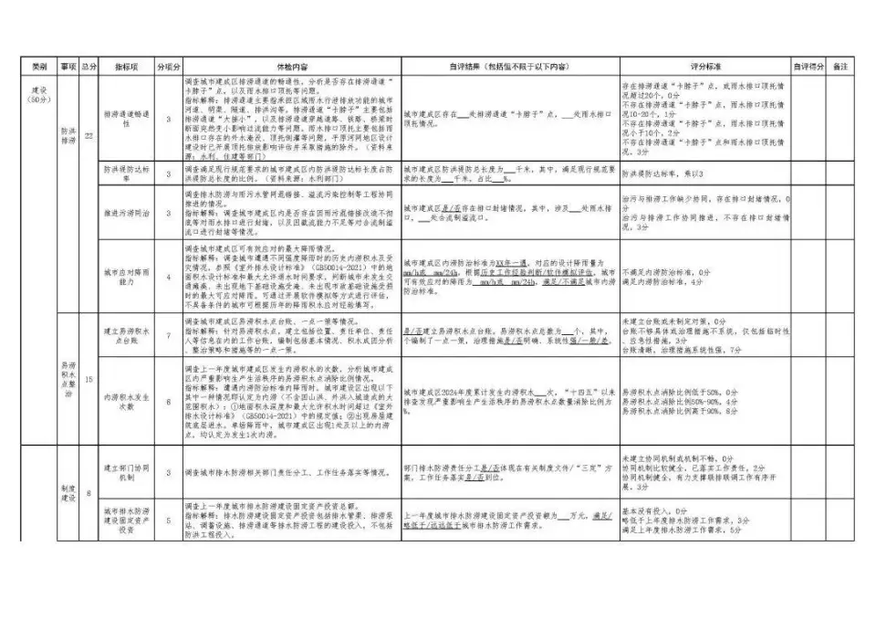 為深入貫徹落實黨中央、國務(wù)院決策部署,建立城市內(nèi)澇治理評估機制,我們在2024年組織開展城市排水防澇專項體檢自評估的基礎(chǔ)上,研究更新了《城市排水防澇專項體檢指標(biāo)表(2025年)》(見附件,以下簡稱“指標(biāo)表”),現(xiàn)印發(fā)給你們。請你們結(jié)合2025年汛前準(zhǔn)備、隱患排查等工作,組織開展城市排水防澇專項體檢自評估,全面排查城市防洪排澇體系的問題短板和薄弱環(huán)節(jié)。專項體檢要覆蓋全部城市(包括地級及以上城市、縣級市,不含下轄縣、鄉(xiāng)、鎮(zhèn))。針對體檢發(fā)現(xiàn)的問題,屬于本部門的,要明確措施和整改時限,持續(xù)推進解決;需要相關(guān)部門解決的,城市建設(shè)(排水)部門要報告屬地政府,及時反饋和移交。