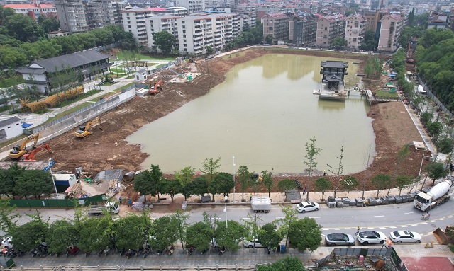 6月24日,在“兩湖”綜合治理工程調(diào)蓄池及雨水循環(huán)中心工程現(xiàn)場(chǎng),工人在進(jìn)行掃尾工作。工程建成后,初期雨水將實(shí)現(xiàn)就地處理,達(dá)標(biāo)后直接補(bǔ)充湖水,讓兩湖煥發(fā)新的生機(jī)與活力。工程除了水處理及辦公功能外,還將為市民呈上全新的生態(tài)文化景觀,增添又一休閑好去處。