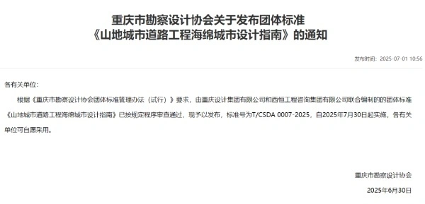 由重慶設(shè)計(jì)集團(tuán)有限公司市政設(shè)計(jì)研究院主編的《山地城市道路工程海綿城市設(shè)計(jì)指南》于2025年7月30日起實(shí)施。主要內(nèi)容涵蓋道路海綿指標(biāo)的確定、計(jì)算方法、設(shè)施布局、設(shè)施設(shè)計(jì)及植物配置等關(guān)鍵環(huán)節(jié),并針對當(dāng)前道路海綿城市建設(shè)中存在的海綿指標(biāo)界定不清、設(shè)施計(jì)算不規(guī)范、滯留帶收水效率低及植物景觀效果欠佳等問題提出了差異化解決方案,兼具適用性和可操作性。