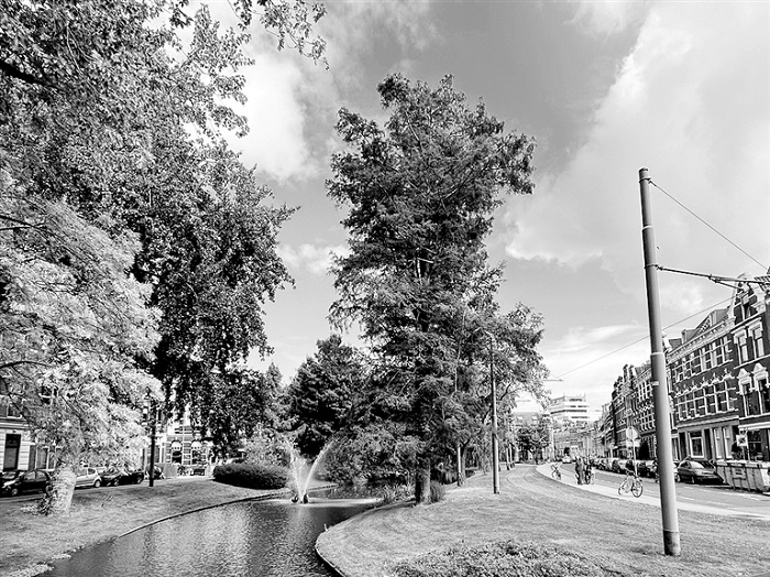 “城市熱島效應”日益加劇,在市中心和老城區(qū)尤為明顯,成為鹿特丹迫切需要應對的氣候挑戰(zhàn)。為此,鹿特丹通過一系列景觀策略為城市降溫,核心舉措是系統(tǒng)性增加“涼爽場所”——面積超過200平方米、炎熱時體感溫度能維持在38℃以下的公共空間。市政府與迪弗科托景觀事務所共同繪制“涼爽場所地圖”與“距離地圖”,評估現(xiàn)有涼爽空間分布,識別距離居民區(qū)超過300米(即世界衛(wèi)生組織建議標準)的服務盲區(qū),重點關注市中心、老城區(qū)及部分新建社區(qū)。為實現(xiàn)降溫目標,鹿特丹采用綜合性景觀干預方案:增種樹木和設置遮陽篷提供蔭涼;利用噴泉與植被增強蒸發(fā)冷卻效應;采用淺色鋪裝及增加綠化減少地表熱量吸收;結合水體景觀直接降溫;增設街道家具、提升步行空間品質,激活未被充分利用的區(qū)域。這些措施被整合進覆蓋全市38個街區(qū)的“涼爽公共空間機會地圖”,將降溫策略與城市更新項目緊密結合,優(yōu)先改善服務不足的區(qū)域。